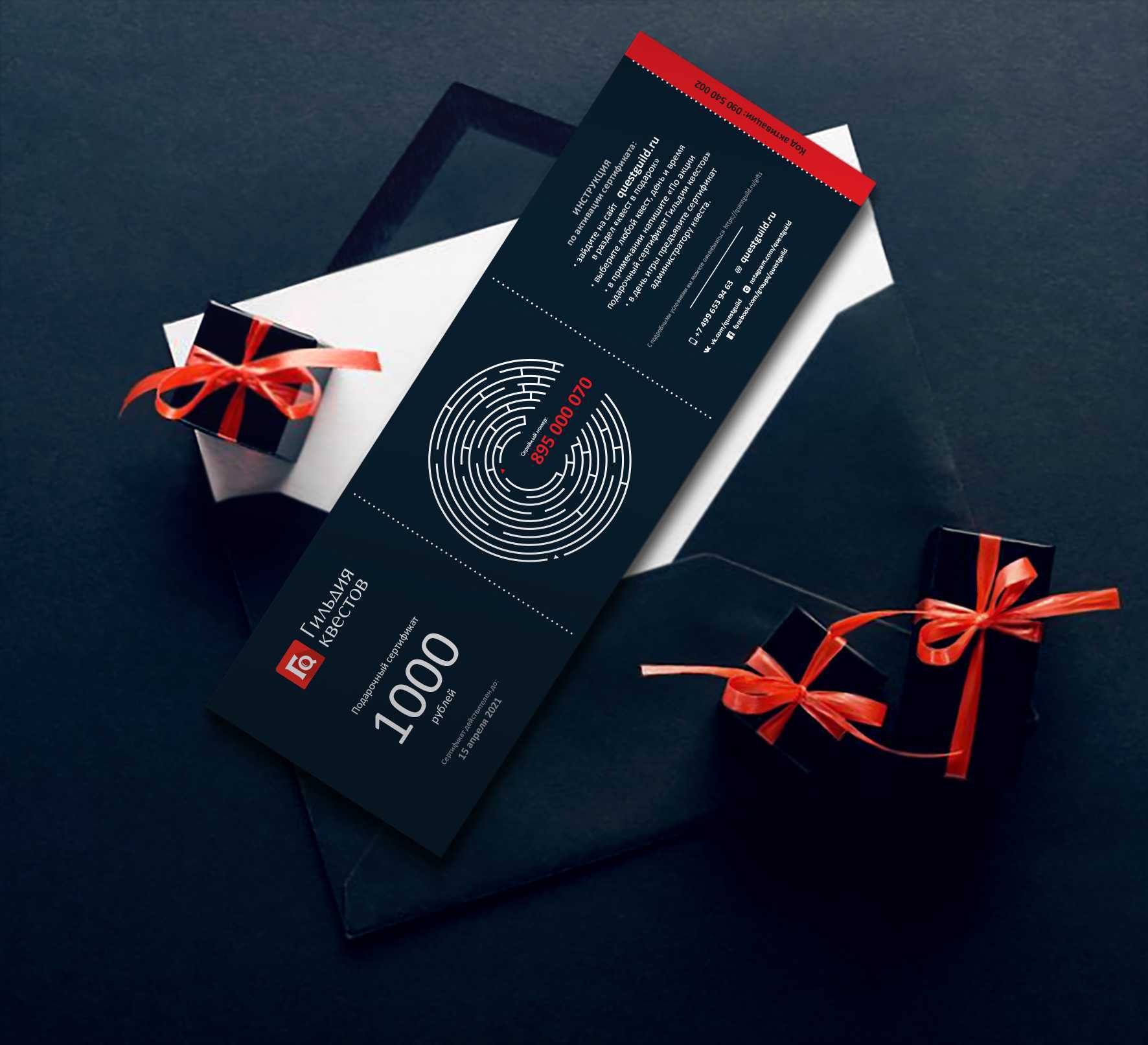 Купить СертификатНужно много подарков сразу? Покупайте от 3-х сертификатов за раз по специальной цене! Пишите нам на manager@questguild.ru или звоните +7 (831) 262–16–03.
